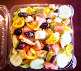 Tomatoes, cucumbers, onions, olives, and feta cheese in an olive oil dressing. Supersized for your party.